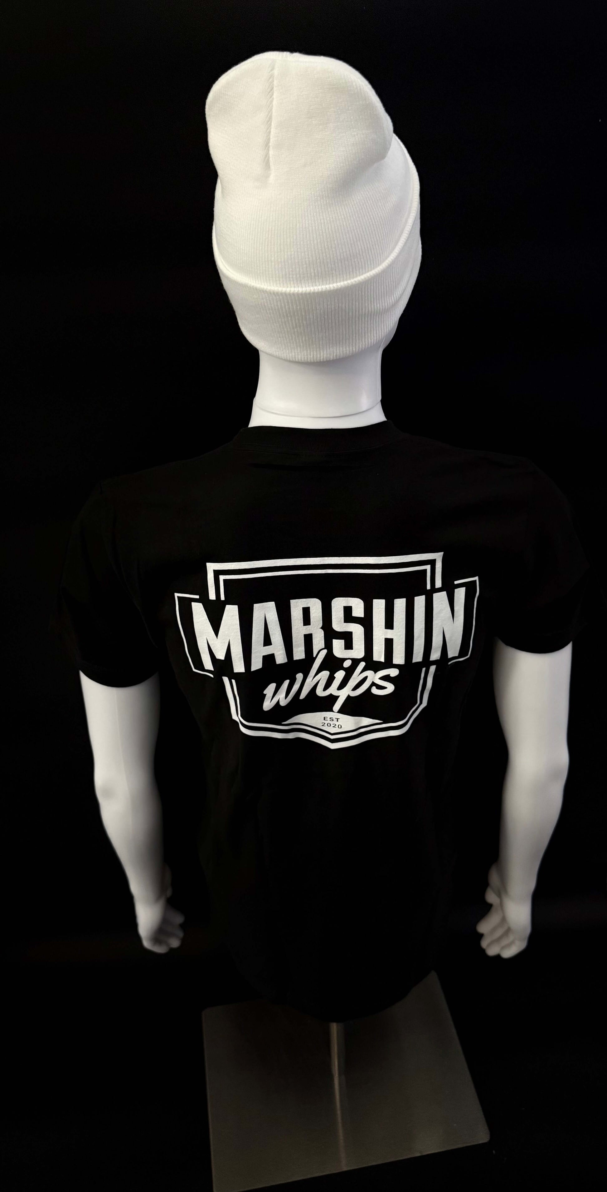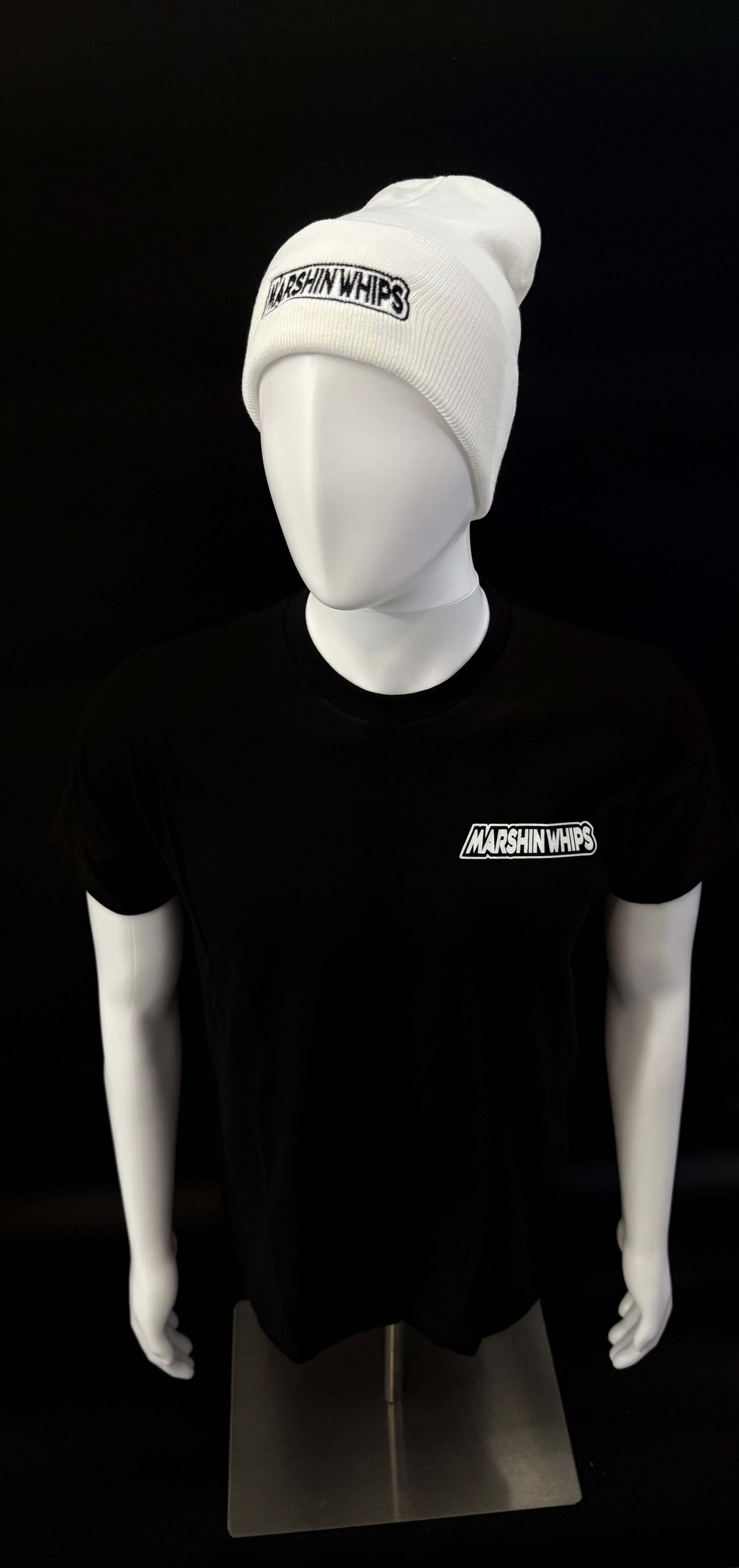 Classic white beanie with embroidered Marshin Whips branding